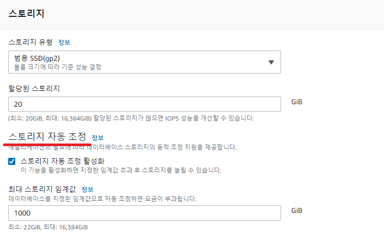 - 자동으로 사이즈 조절하려면 스토리지 자동 조정 활성화(autoscaling)