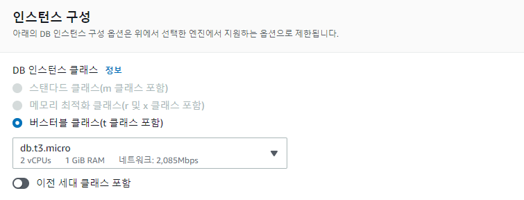 - DB 인스턴스 클래스(db instance size) : Burstable classes 선택 (free tier에서는 다른건 선택권 없음!)