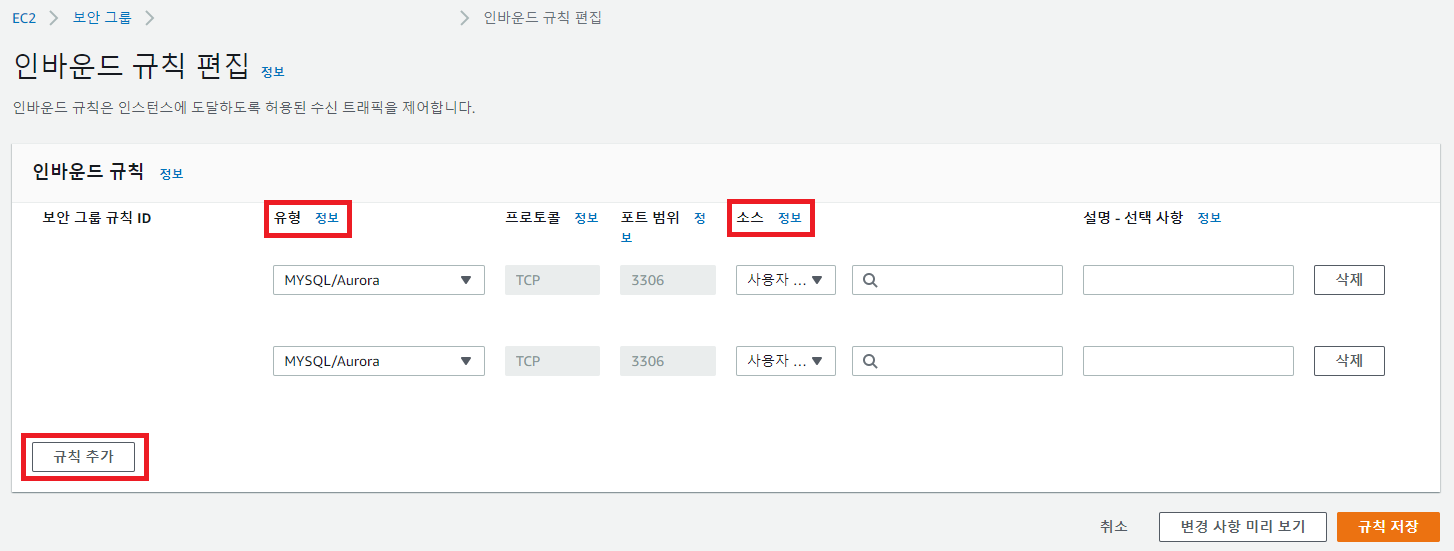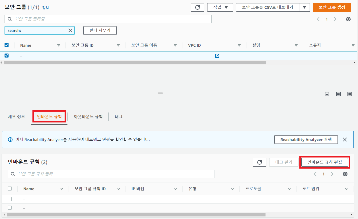 1. 보안의 VPC 보안 그룹 이름을 클릭(파란 글씨로 되어있음)