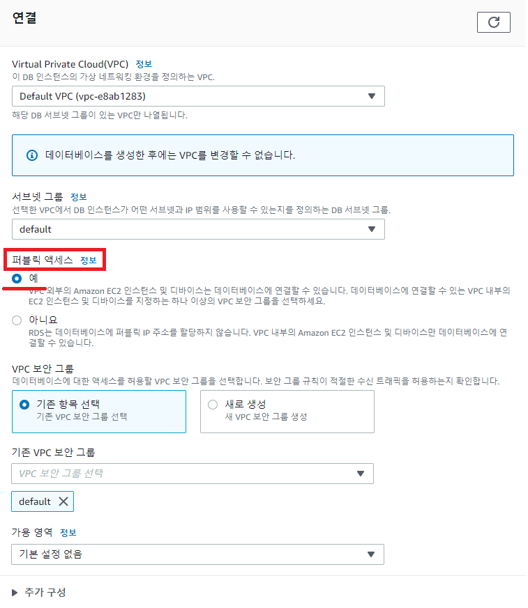 - 퍼블릭 액세스 가능: 예로 설정. (외부에서 연결할거니까)