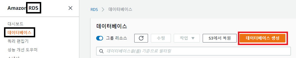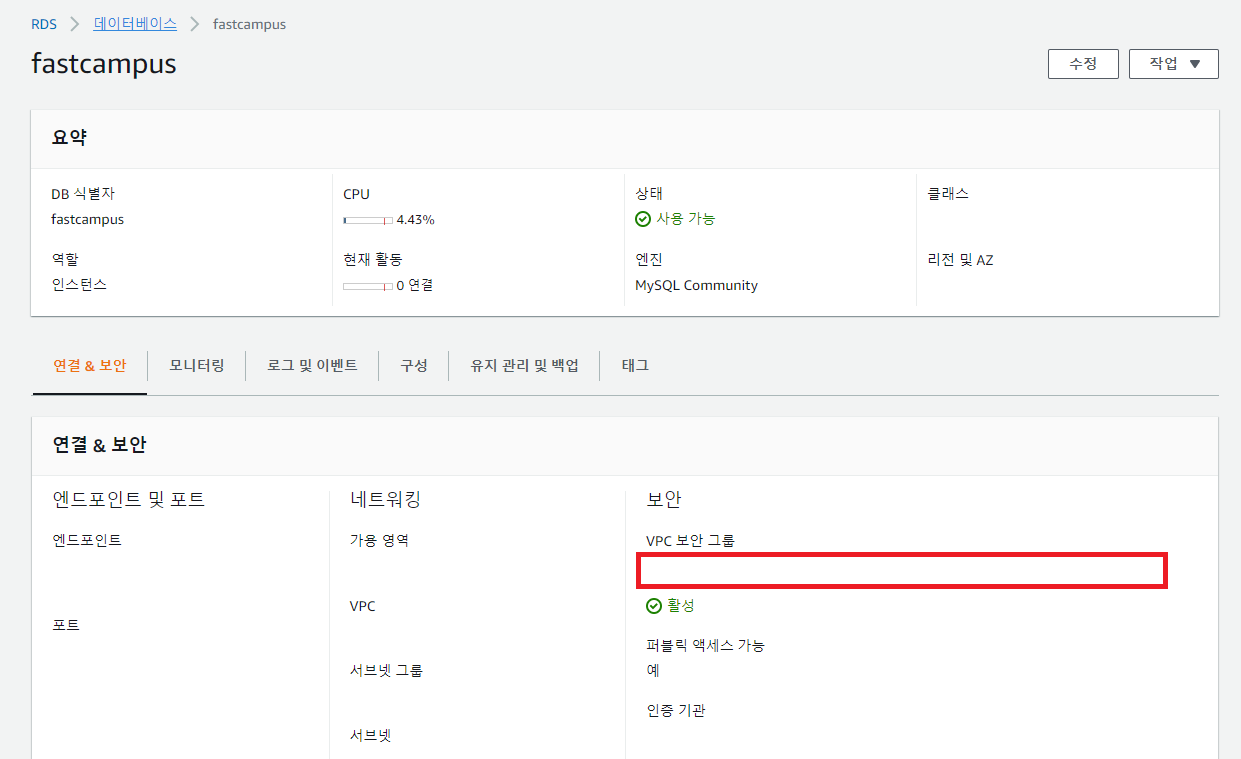 + 생성 후에 VPC security groups 부분이 설정 안되어 있을 수 있음