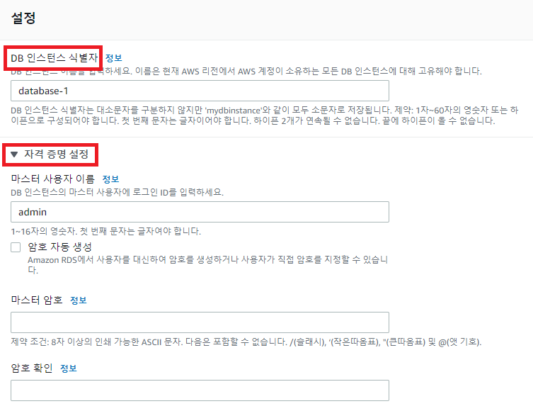 - identifier(DB 인스턴스 식별자) : DB 이름